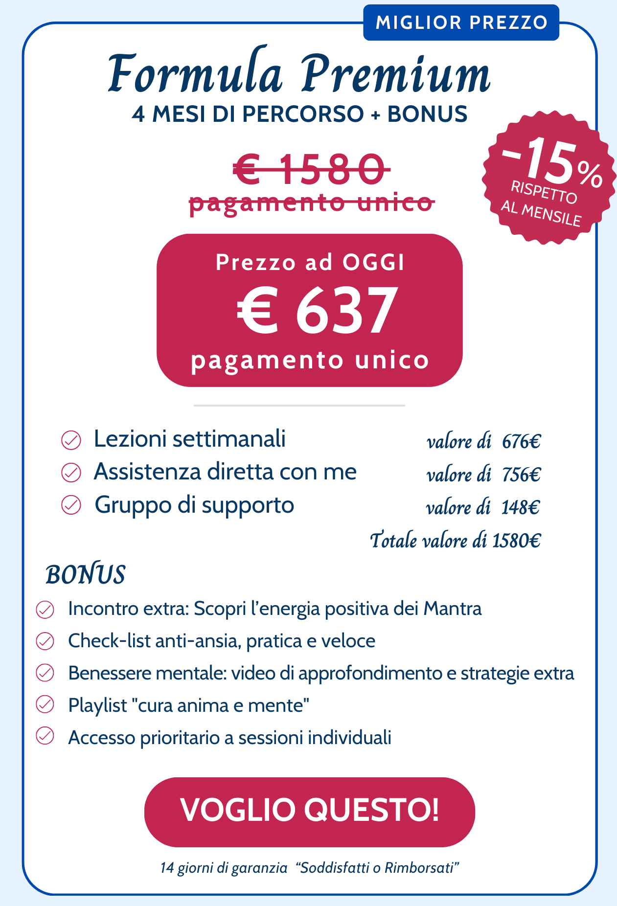 4 mesi in cui impari come gestire ed eliminare le tue crisi d'ansia, come mantenere la lucidità, eliminare paure e pensieri negativi, ma soprattutto tutte le tecniche di cui hai bisogno.